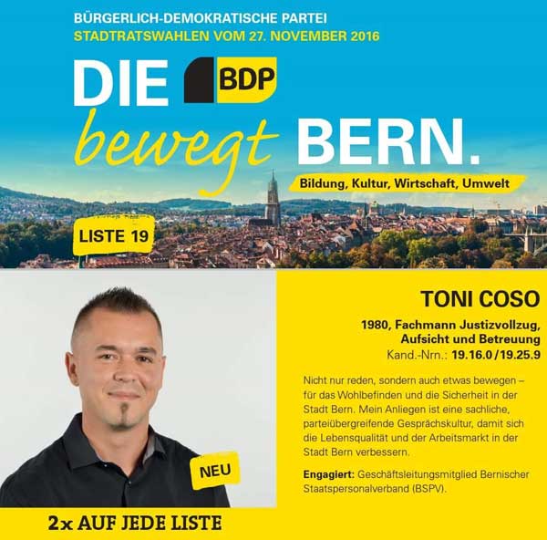 Tako je naš sugovornik, Toni Ćoso odlučio postati aktivan i kandidira za gradsko vijeće grada Berna na općinskim izborima 27. studenog 2016.