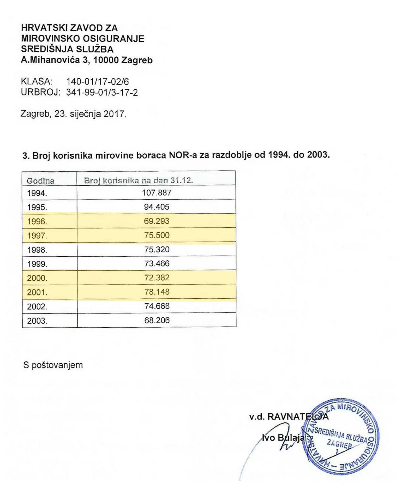 Broj korisnika mirovina boraca NOR-a za razdoblje od 1994 do 2003 godine;