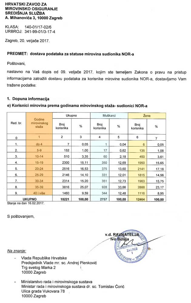 Naime, nakon punih 27 godina na službeni zahtjev, temeljem Zakona o pravu na pristup informacijama, HZMO je bio prisiljen javno objaviti podatke o korisnicima mirovine prema godinama mirovinskog staža – sudionicima NOR-a.