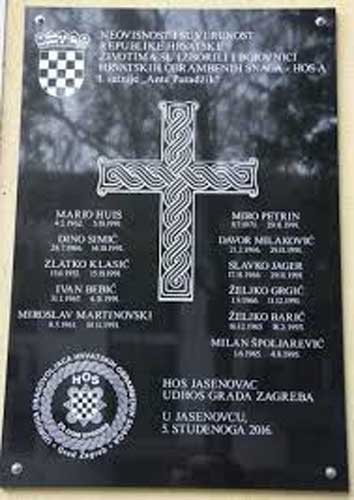 Izraziti primjer je Ploča poginulih pripadnika HOS-a koja je morala biti izmještena. Nesrazmjer velikog kamenog cvijeta Jasenovca i male ploče na zidu zgrade vrtića u Jasenovcu simbolično pokazuje nesrazmjer borbe Davida i Golijata. Gdje je Hrvatska David, koja je uspjela pobjediti Golijata Srbiju i JNA koja je bila 3. armija po snazi u Europi!