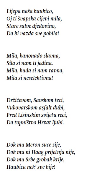 Zanimljivo, takvi stihovi su satira i parodija??? ” Haubica nek sve bije, dok mu Srbe grobak krije” ??? ” Stare slave djedovino, da bi vazda sve pobila”, ne tu nema kaznenog djela, proglasiti Hrvate da su ubojice, nema kaznenog djela??? Čudni neki, rastezljivi kriteriji ” nadležnih sudskih institucija” !