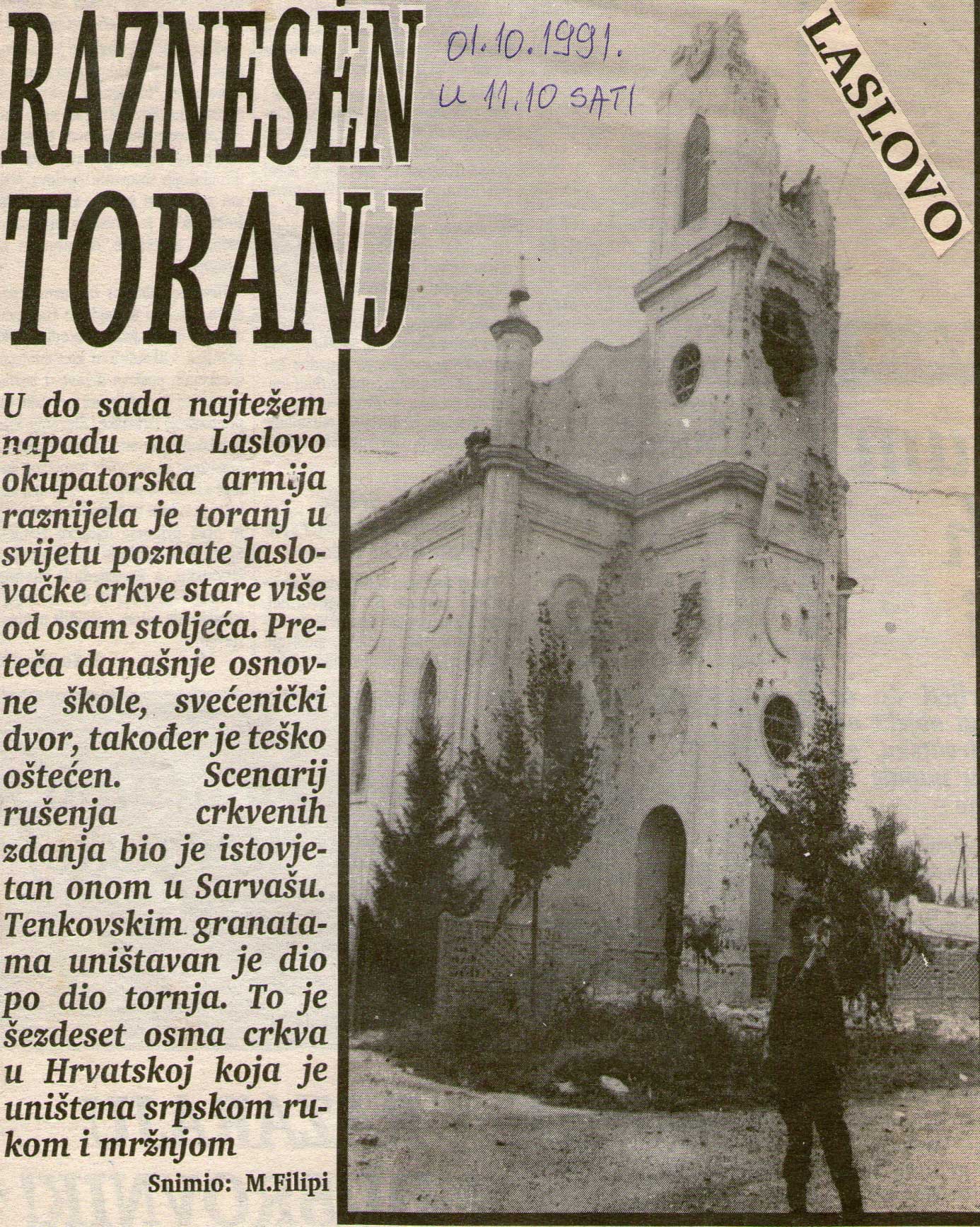 „Obnašao sam dužnosti na punktu „Sokol 7“ sve dok nisam lakše ranjen. Onda sam prešao raditi u zapovjedništvo gdje sam vodio evidenciju. Prva žrtva agresije u Laslovu bio je civil, gospodin Stjepan Bajus star 70 godina koji je poginuo nakon što su 22. kolovoza 1991.godine, srbi iz susjedne Palače granatirali Laslovo. Otada pa skroz do privremene okupacije Laslova svaki dan je nosio žrtve. Svaki dan nemilice su padale granate. Jedno vrijeme smo ih brojali, a kasnije ih se već nije moglo ni brojati jer gađali su nas svaki dan s tisućama granata… Sjećam se da je prvi VBR u Laslovu proradio 2. listopada. To je bilo veliko veselje da mi i njima možemo malo papreno vratit, kao što su oni nama dosad vraćali.  Nažalost, žrtve na našoj strani bile su sve veće. Danas brojimo 48 poginulih i 29 branitelja koji su umrli nakon razvojačenja. To je jako puno za jedno selo koje je 1991. imalo 1.298 stanovnika. Nacionalna struktura Laslova bila je skoro 50-50% Mađara i Hrvata, ali su još tu bili i Srbi, Slovenci, Makedonci, Albanci. Ali, tada smo svi bili jednaki. Među nama je vladala neviđena sloga i svi smo bili spremni poginuti za dom i za obranu svog sela“.